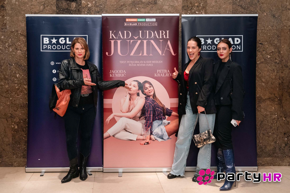 Popularne glumice Petra Kraljev i Jagoda Kumrić na premijernoj zagrebačkoj izvedbi komedije Kad udari južina svojim su urnebesnim prijateljskim problemima u do posljednjeg mjesta ispunjenom gledalištu KD Vatroslav Lisinski naprosto oduševile više od 300 građana. Komplicirani ženski odnosi, međusobne svađe i optuživanja, ljubomora, ali i neraskidiva prijateljska veza zaslužili su ovacije posjetitelja. U prvim redovima predstavu su pomno pratili i poznati glumci Petra Kurtela, Ana Uršula Najev, Nika Barišić, Marina Redžepović, Mijo Kevo, Petra Dugandžić, Toni Malenica i Manuela Svorcan, koji su u svojim prijateljskim odnosima kroz život sasvim sigurno proživjeli barem jednu od ovih uzbudljivih scena.