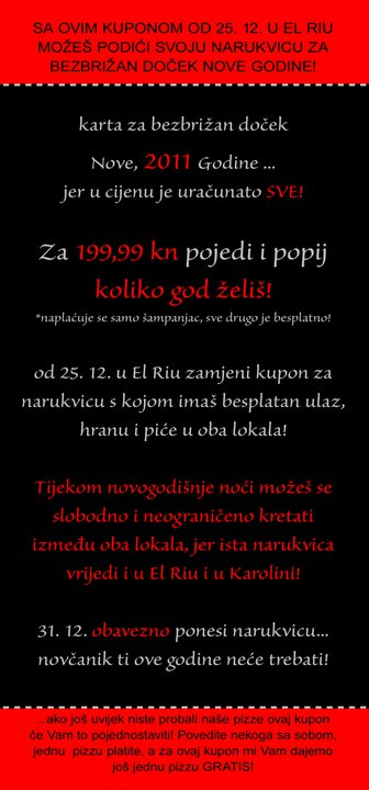Prvi kupon se do 25.12. zamijeni na šanku za narukvicu sa kojom se u novogodišnjoj noći možete neograničeno kretati između El Ria i Karoline te za samo 199 kn (cijena karte) možete piti i jesti koliko god želite. U cijenu je uračunato apsolutno sve osim šampanjca.