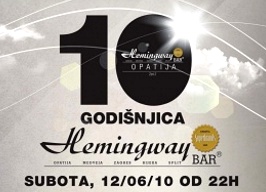 Hemingway Bar Opatija poziva vas u subotu 12. lipnja 2010. na 10. godišnjicu Hemingway Bara Opatija. Direktno iz Londona stižu: House atrakcija High on heels, Ady Jay - London, ButcHerd Beats - London i DJ Joe2shine - Croatia.