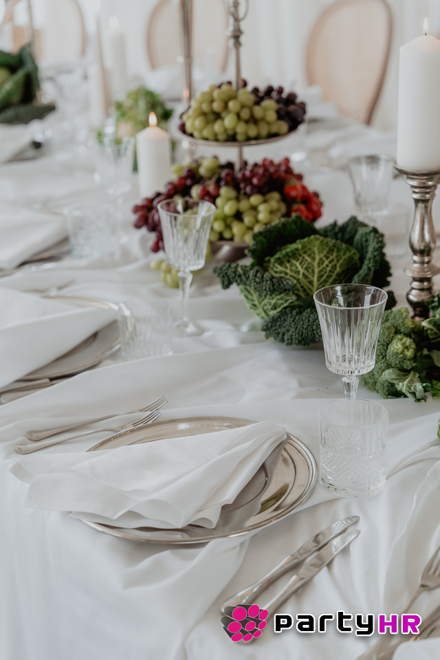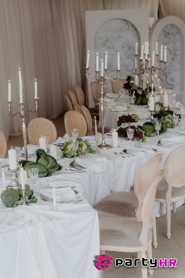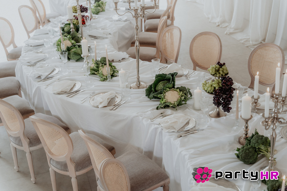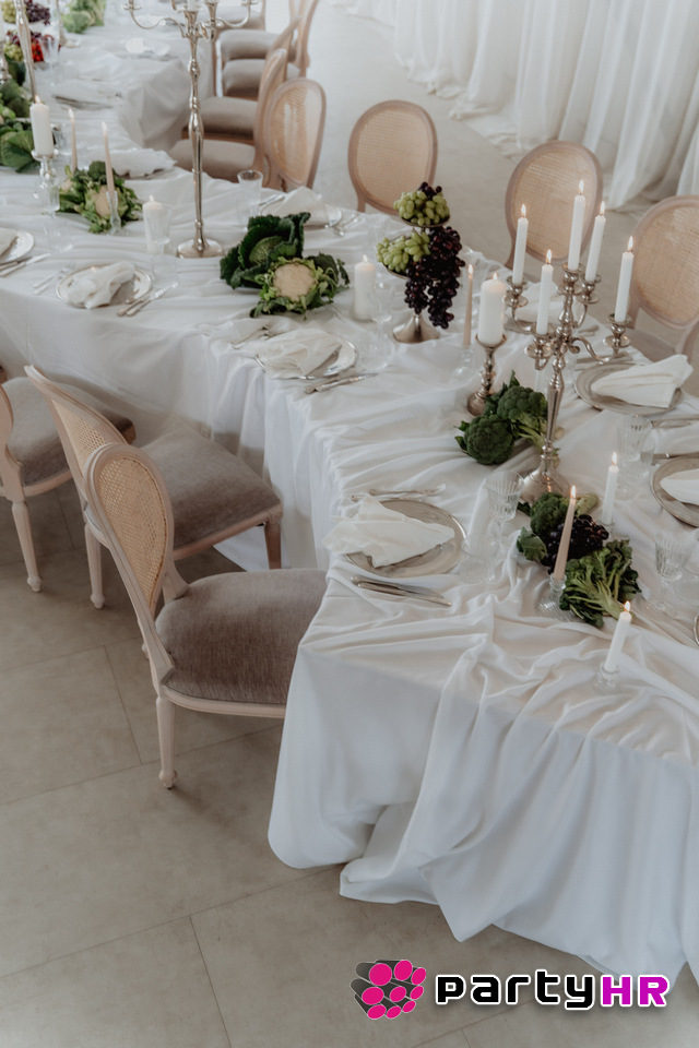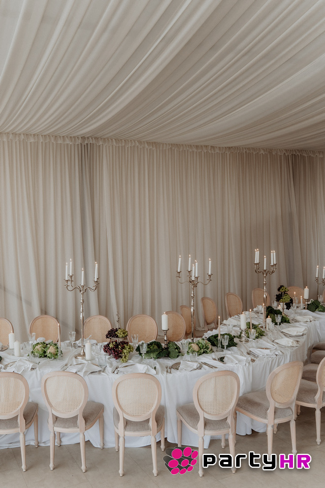 4. Drapery uređenje stolova - Nabrana tkanina koja pada preko stolova dodaje sofisticiranost i vizualni dojam luksuza.