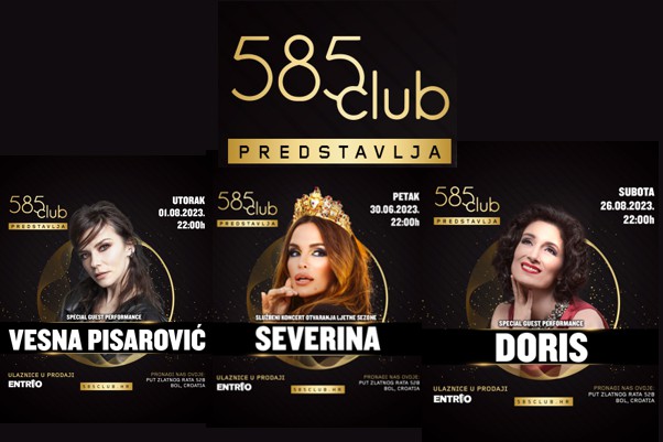 Tituli jednog od najljepših klubova na Mediteranu, koji 585 Club nosi već godinama, od sada se može pridružiti i ona o jednom od najuspješnijem i najposjećenijem hrvatskom ljetnom klubu. Vrhunski klupski program, brojni domaći i međunarodni izvođači, samo su dio prave zlatne magije koja svako ljeto zarobi srca tisuća posjetitelja ovog posebnog mjesta u Bolu. Ovo će ljeto obilježiti i koncertni spektakli tri glazbene dive! Severina već tradicionalno najavljuje dolazak ljeta u 585 Club, a datum ovogodišnjeg nastupa je 30. lipnja. Vesna Pisarović nastupa 1. kolovoza dok je čast da zatvori još jednu uzbudljivu sezonu pripala bezvremenskoj Doris Dragović, koja stiže 26. kolovoza. Ulaznice se od danas mogu osigurati putem sustava Entrio.